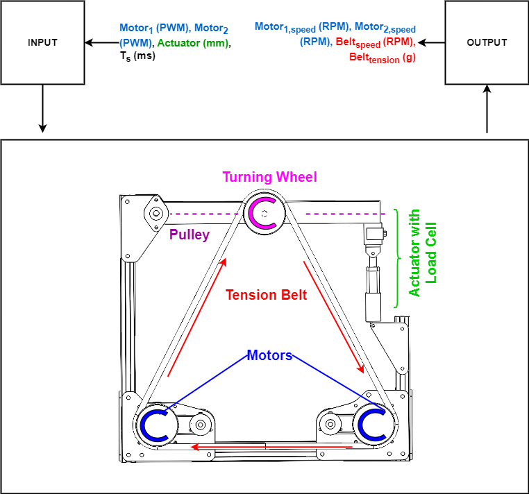 Input: The inputs to this system include control signals for the two motors, Motor1 and Motor2, in the form of PWM (Pulse Width Modulation) signals. These signals regulate the speed and torque of the motors, ensuring precise control over the movement of the system. Additionally, the actuator's displacement in millimeters is another input parameter that allows for adjustments to the belt's tension. These inputs enable dynamic manipulation of the mechanical components to achieve the desired performance.
